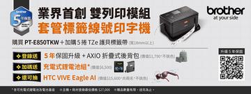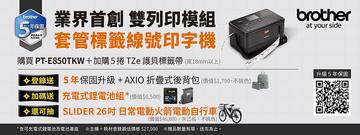 購買 PT-E850TKW 主機並加購五捲 18mm 以上 TZe 標籤帶,完成登錄可免費獲得價值 $6,500 專屬鋰電池組合(電池 PA-4000Li + 電池蓋 PA-BB-003)。