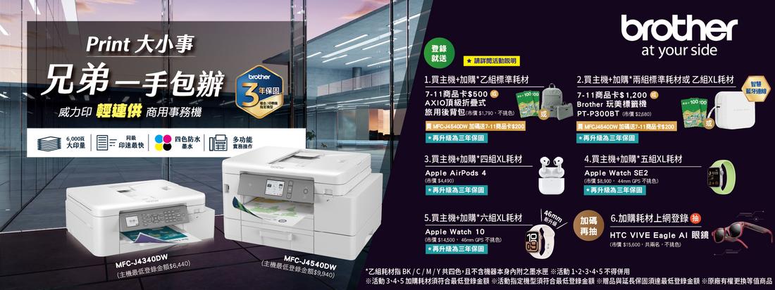 6. 所有贈品以實物為準,圖片僅供參考;本活動贈品出貨時若遇停產、缺貨…等不可抗力因素而無法正常出貨時,Brother 有權得以其他等值商品替代。