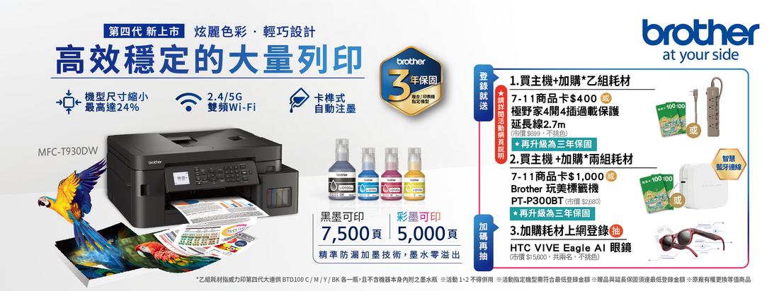 升級三年保固送好禮,再抽 HTC VIVE Eagle AI 眼鏡(市價 NTD $15,600, 不挑色)共兩名(MFC-T930DW、DCP-T830DW、DCP-T730DW、DCP-T535DW、DCP-T430W、DCP-T230)