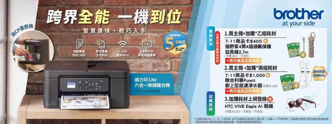 升級五年保固送好禮,再抽 HTC VIVE Eagle AI 眼鏡(市價 NTD $15,600, 不挑色)共兩名(DCP-J1360DW)
