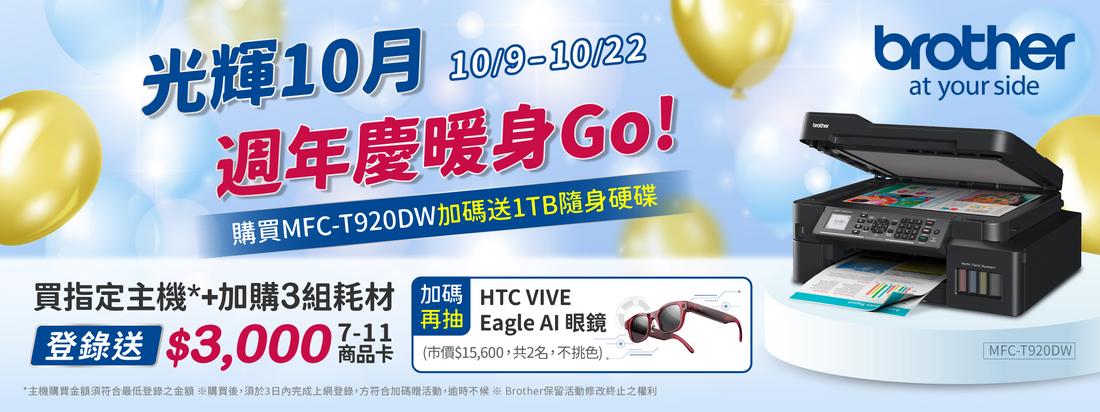 限量快閃,超狂回饋。指定主機加購主機與 3 組耗材,上網登錄寄回標籤,可得7-11商品卡 3,000 元(MFC-T920DW、MFC-J4340DW)