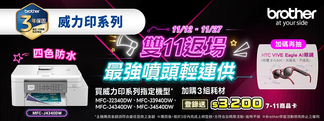 限量快閃,超狂回饋。指定主機加購 3 組耗材,上網登錄寄回標籤,可得 7-11 商品卡 3,200 (MFC-J4340DW、MFC-J4540DW、MFC-J2340DW、MFC-J3940DW)