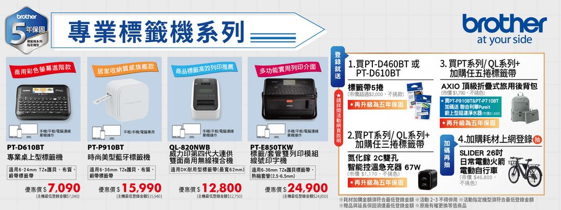 1. 購買 PT-D460BT 或 PT-D610BT,上網登錄就送 5 捲標籤帶(市價超過 NT $2,000)