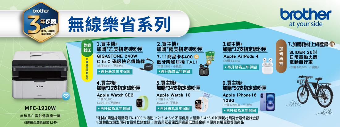 升級三年保固送好禮,再抽 SLIDER 日常電動火箭 26 吋帥氣紳士電動自行車(市價 NTD $46,800, 不挑色)共乙名(MFC-1910W、HL-1210W、DCP-1610W)