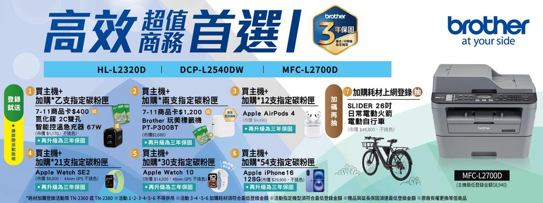 升級三年保固送好禮,再抽 SLIDER 日常電動火箭 26 吋帥氣紳士電動自行車(市價 NTD $46,800, 不挑色)共乙名(MFC-L2700D、DCP-l2540DW、HL-L2320D)