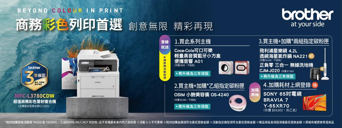 3. 買此系列主機,加購兩組 CMYK 碳粉匣 ,登錄可選以下贈品乙個,再升級為三年保固。