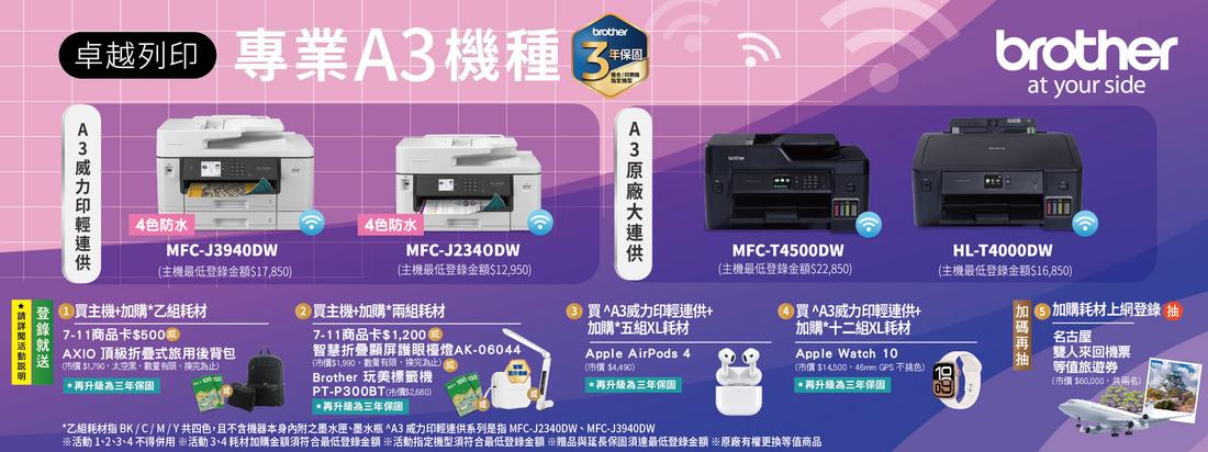 3. 購買^A3 威力印輕連供系列(MFC-J2340DW 或 MFC-J3940DW),加購*五組 XL 大容量耗材,登錄可獲得 Apple AirPods 4(市價 NT $4,490),再升級為三年保固。