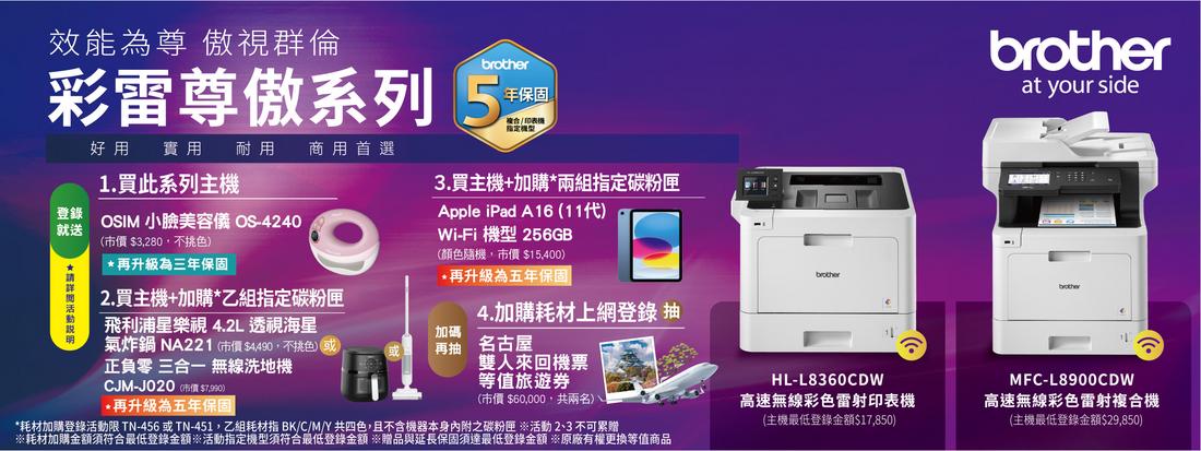 3. 買此系列主機,加購兩組 CMYK 碳粉匣(限 TN451 或 TN456),登錄可獲得 Apple iPad A16(11 代) 256G Wi-Fi (顏色隨機,市價 NT $15,400) ,並升級為五年保固